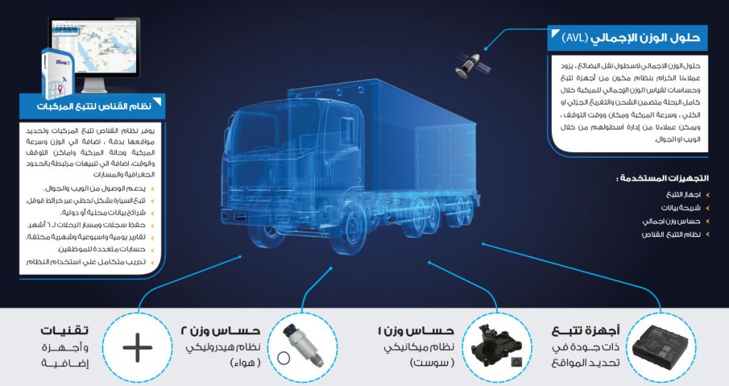Total weight solutions for the cargo transportation fleet, provides our valued customers with a system consisting of tracking devices and sensors to measure the total weight of the vehicle during the entire trip, including partial or total loading and unloading, the vehicle’s speed, place and time of stopping, and enables our customers to manage their fleet through the web or mobile..