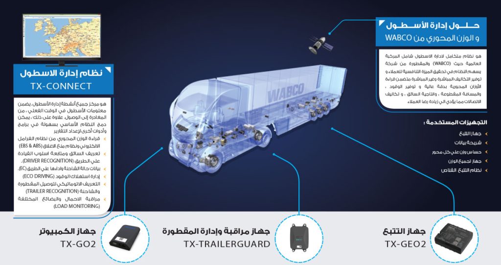 It is an integrated system for managing the fleet, including the vehicle and the trailer, from the global company (WABCO), where the system contributes to achieving the competitive advantage for customers and saving direct and indirect costs, including reading axial weights with high accuracy, saving fuel, mileage, driver productivity, and communication costs, which leads to Increase customer satisfaction.